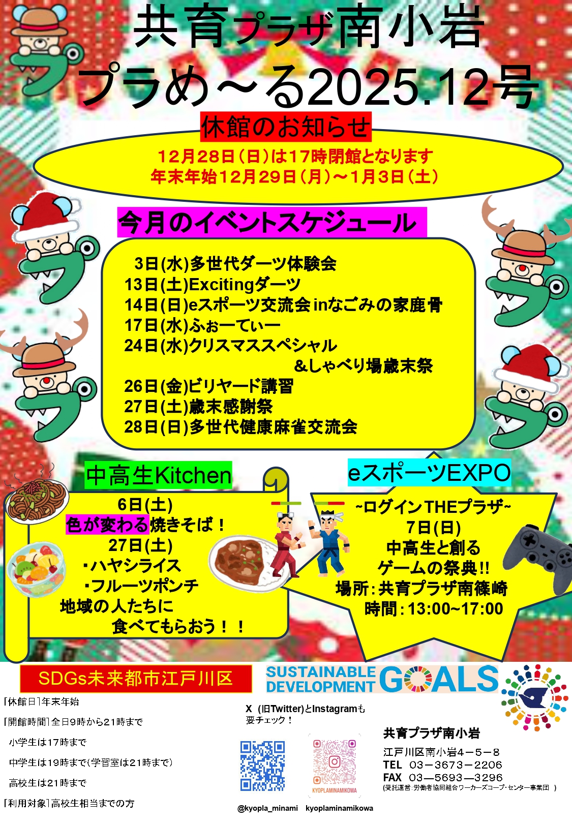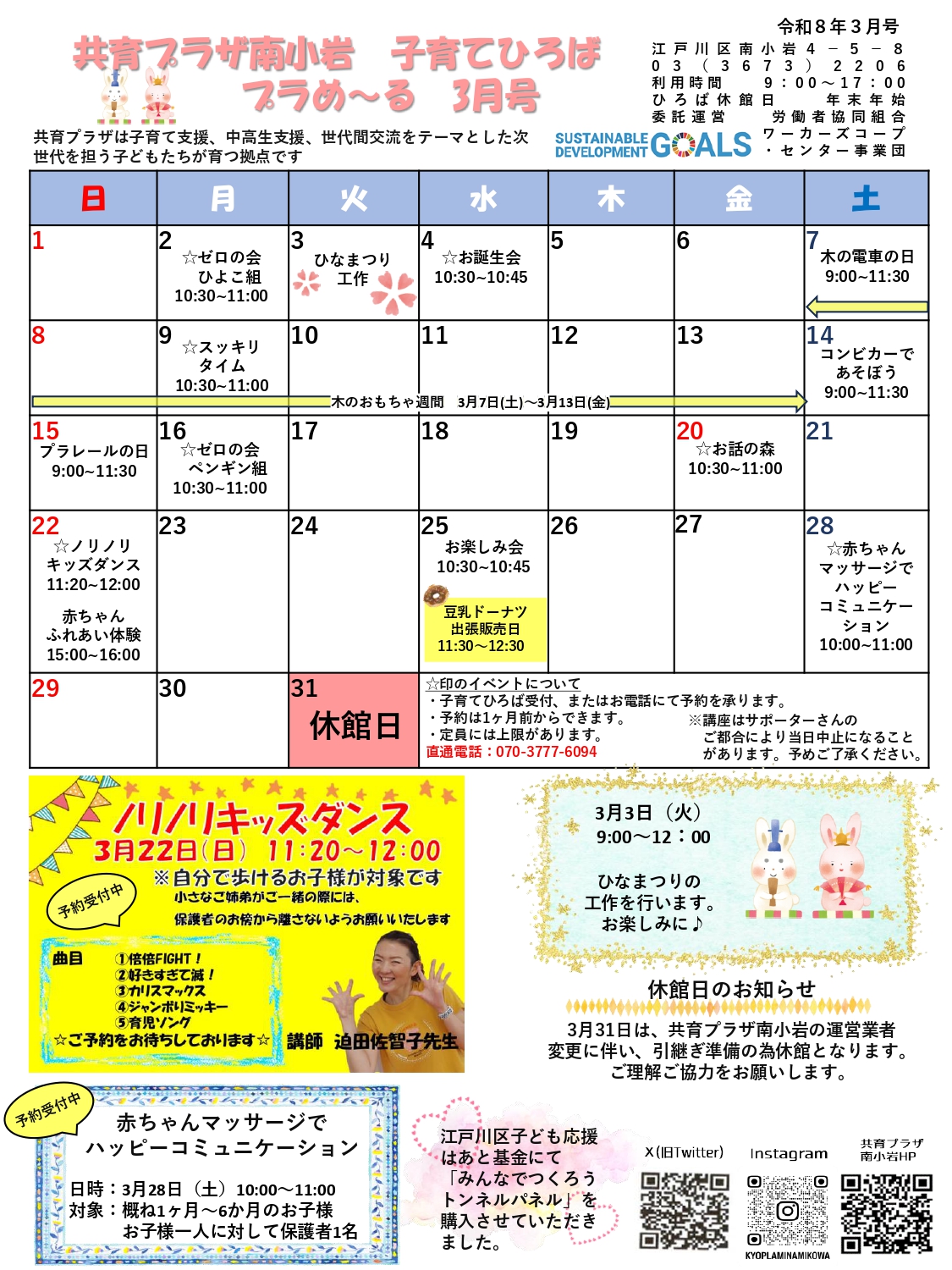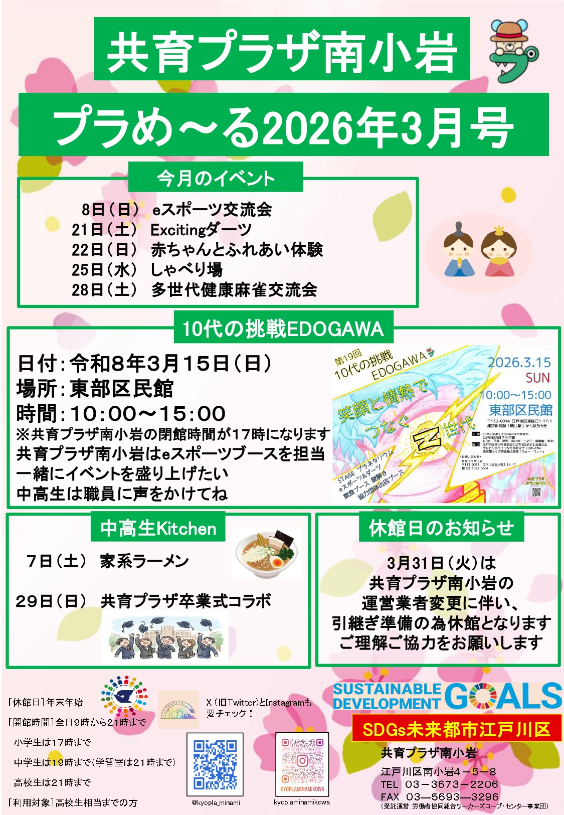 ・ご利用になられる共育プラザ各館のホームページや、掲示等をご覧ください。。。。利用案内。。休館日:年末年始。。開館時間 。全日:午前9時から午後9時。子育てひろばは午前9時から午後5時。。。利用対象者。。 乳幼児(0才)から高校生(18才の年度末)まで。 未就学児は保護者の付き添いが必要です。。。利用時間。。開館時間 は午前9時から午後9時 。休館日は年末年始です。 乳幼児と保護者は午前9時から午後5時。 小学生は午前9時から午後5時。 中学生は午前9時から午後7時。 ただし学習室利用に限り、午後9時まで利用できます。 高校生:午前9時から午後9時。 となっています。。。所在地。東京都江戸川区南小岩四丁目5番8号。。電話番号は03-3673-2206 。。FAX番号は03-5693-3296です。
